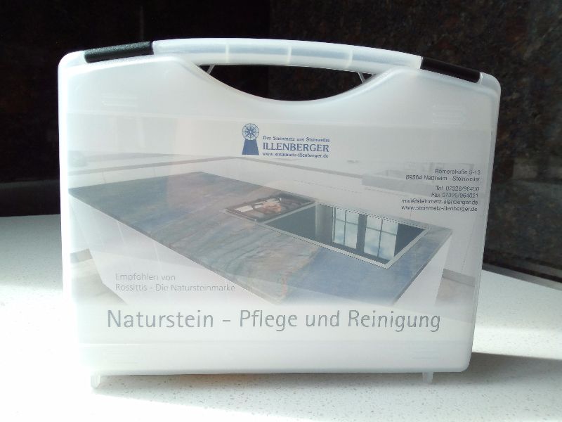 | Ist ein speziell konzipiertes Set zum Reinigen, Schützen und Pflegen von Tischen und Theken im Wohn- und Essbereich, Küchenarbeitsplatten, Waschtischen, Ablagen usw. aus Natur- und Kunststein mit polierter, feingeschliffener oder gebürsteter Oberfläche. Durch die Verwendung der einzelnen Produkte wir die Steinoberfläche optimal gereinigt, geschützt und gepflegt. Der zurückbleibende Schutz ist gesundheitlich unbedenklich. |